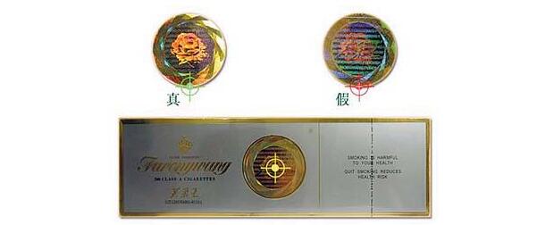 (2)看防偽標記:條盒的正面芙蓉花防偽標記,真煙的印刷在同一側(cè)面看到的只有一個圖樣;假煙的印刷在同一側(cè)面看到是幾個在一起的圖樣。