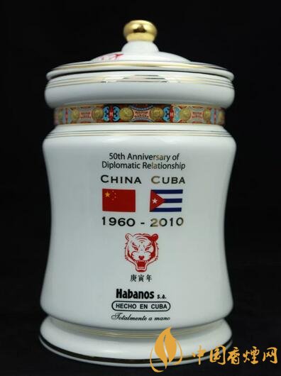 該藏品采用獨特瓷罐包裝,瓷罐上印有中國古巴國旗、中古建交時間、中國虎頭圖騰等,并用中文標注上了“庚寅年”,罐蓋上附有加溫器,并用軟木做密封。內(nèi)含25支環(huán)徑為52、長度為 6.4英寸的雙魚雷型雪茄。全球限量2010罐,此罐編號為532號,由時任古巴駐華大使白詩德(Alberto Jesus Blanco Silva)簽贈。