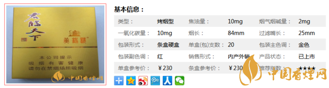 黃鶴樓君臨天下2300元/條,230元/包。香氣均勻和諧,外觀(guān)精致,因?yàn)閮r(jià)格較高,此前一再被網(wǎng)友拿來(lái)炒作,以致于現(xiàn)在在國(guó)內(nèi)都很少有這款煙流通,外銷(xiāo)占比較大。黃鶴樓品種較多,口感方面也是因人而異,具體細(xì)節(jié)還是看個(gè)人習(xí)慣。