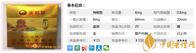 類型 :烤煙型 焦油量 :8mg 煙氣煙堿量 :0.8mg 一氧化碳量 :8mg