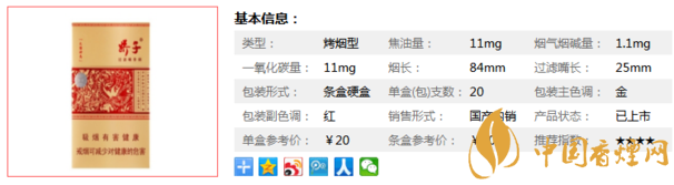 | 類型 :烤煙型 | 焦油量 :11mg | 煙氣煙堿量 :1.1mg | 一氧化碳量 :11mg |