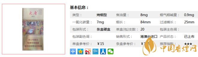 大唐是香港產(chǎn)的香煙,目前中國(guó)市場(chǎng)上面并不多。下面我們一起來(lái)看看它的參數(shù)信息。煙長(zhǎng)84mm,焦油量8mg,煙堿量0.9mg,一氧化碳量7mg。