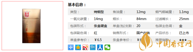 | 類型 :烤煙型 | 焦油量 :12mg | 煙氣煙堿量 :1.1mg | 一氧化碳量 :14mg |