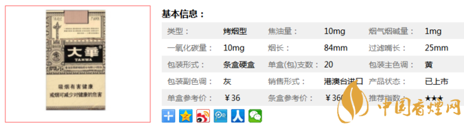 | 類型 :烤煙型 | 焦油量 :10mg | 煙氣煙堿量 :1mg | 一氧化碳量 :10mg |
