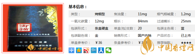 | 類型 :烤煙型 | 焦油量 :11mg | 煙氣煙堿量 :1.2mg | 一氧化碳量 :12mg |