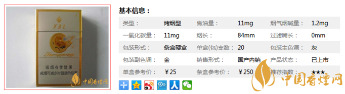類型 :烤煙型 焦油量 :11mg 煙氣煙堿量 :1.2mg 一氧化碳量 :11mg