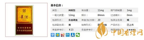 類型 :烤煙型 焦油量 :11mg 煙氣煙堿量 :1mg 一氧化碳量 :12mg