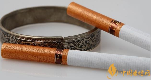 暗金色的外包裝,硬盒磨砂質(zhì)地,細(xì)膩舒適的手感,以煙葉脈絡(luò)和航海圖作為外包裝圖案,暗喻煙草從1492年發(fā)源于印第安,從此走入歐洲走向世界。背景是一片葉子,葉的脈絡(luò)非常清晰。三分之一處紅色分割線隔開,下面是大字警語“吸煙有害健康 戒煙可減少對(duì)健康的危害”,紅色黑體字。