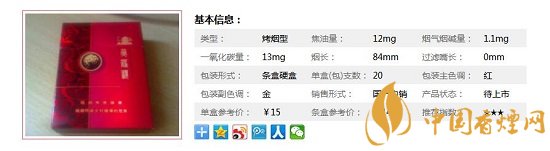 | 類(lèi)型 :烤煙型 | 焦油量 :12mg | 煙氣煙堿量 :1.1mg | 一氧化碳量 :13mg |