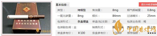 | 類(lèi)型 :烤煙型 | 焦油量 :8mg | 煙氣煙堿量 :0.8mg | 一氧化碳量 :8mg |