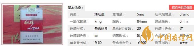 類型 :烤煙型 焦油量 :5mg 煙氣煙堿量 :0.5mg 一氧化碳量 :7mg