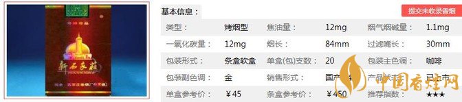 | 類型 :烤煙型 | 焦油量 :12mg | 煙氣煙堿量 :1.1mg | 一氧化碳量 :12mg |