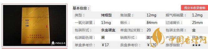 | 類型 :烤煙型 | 焦油量 :8mg | 煙氣煙堿量 :0.9mg | 一氧化碳量 :10mg |