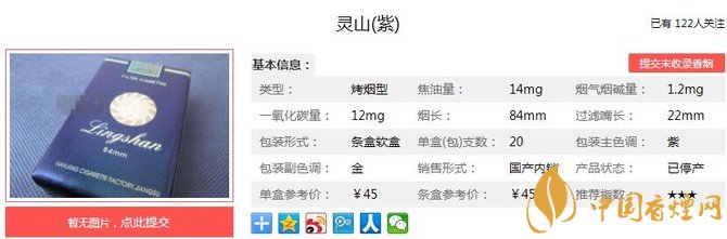 靈山紫煙支長(zhǎng)84mm,過(guò)濾嘴長(zhǎng):22mm,精選國(guó)內(nèi)外優(yōu)質(zhì)原料的絕佳部位,并利用從德國(guó)、美國(guó)等引進(jìn)的高精密儀器分析出原料中的數(shù)百種致香成分,通過(guò)計(jì)算機(jī)輔助配方設(shè)計(jì)進(jìn)行最佳組合。下面我們一起來(lái)看靈山紫的參數(shù)信息:焦油量:14mg 煙堿量:1.2mg 一氧化碳量:12mg