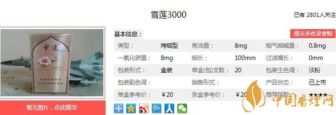 雪蓮3000煙支長100mm,過濾嘴長不詳,在制作工藝上,結(jié)合葉組配方原料的理化和加工特性,集成定制切絲寬度技術(shù)、高溫增香技術(shù)等特色工藝技術(shù),形成與之配套的“超細(xì)支低焦油卷煙個性化制絲工藝加工核心技術(shù)”。下面我們一起來看雪蓮3000的參數(shù)信息:焦油量:8mg 煙堿量:0.8mg 一氧化碳量:8mg