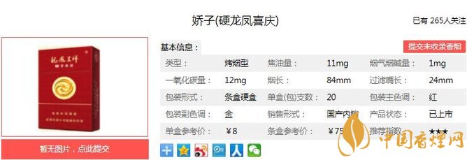 煙支長(zhǎng)84mm,過(guò)濾嘴長(zhǎng)24mm,龍鳳呈祥精品生產(chǎn)線,28個(gè)環(huán)節(jié)精密檢測(cè)品質(zhì)保障,彰顯自然時(shí)尚清新的魅力。下面我們一起來(lái)看嬌子硬龍鳳喜慶的參數(shù)信息:焦油量:11mg 煙堿量:1.0mg 一氧化碳量:12mg
