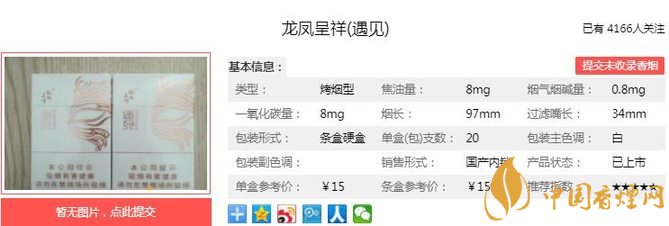 龍鳳呈祥遇見煙支長97mm,過濾嘴長34mm,定位在細支煙品類。精選自優(yōu)質武陵山地的煙葉,煙草本香被完整保留,呈現(xiàn)出飽滿醇和,細膩柔順,本香純正,口感舒適干凈的完美特點。下面我們一起來看龍鳳呈祥遇見的參數信息:焦油量:8mg 煙堿量:0.8mg 一氧化碳量:8mg