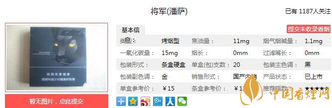 雪茄型卷煙是雪茄和卷煙的融合之作,雪茄型卷煙既符合了年輕、時尚一族消費者新的消費需求,又具有鮮明的時尚個性和濃厚的雪茄風格。2010年,山東中煙就推出了一款極具創(chuàng)新風格的雪茄型卷煙 ——將軍(潘薩),在上市初期,就以鮮明的時尚個性和濃厚的雪茄風格成為了雪茄型卷煙市場的“新寵”,引領中式雪茄新風尚。下面就由香煙網(wǎng)小編帶大家一起來了解將軍潘薩的相關信息。
