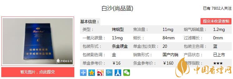 白沙(尚品藍)精選云、貴、川、湘等地優(yōu)質煙葉,經國內頂級配方師設計,采用國際一流加工設備進行標準化加工,從煙葉生產到卷煙生產全過程進行化學成分分析,確保卷煙成品成分平衡,香氣濃郁綿長,口感舒適。下面就由香煙網小編帶大家一起來了解白沙尚品藍的相關信息。