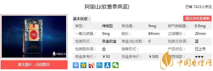 阿里山煙近幾年在國內(nèi)還是比較常見的,這款阿里山(軟景泰典藍)屬于這個系列的高端產(chǎn)品,嚴格遵循全手工選葉,不添加其他填充物,用物理方法提取純天然植物香料,不添加任何化學合成香。經(jīng)香煙網(wǎng)小編市場調(diào)查阿里山軟景泰典藍售價為50元/包。