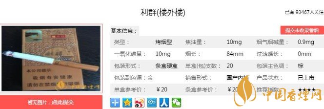 以上便是香煙網(wǎng)小編為大家介紹的關(guān)于利群樓外樓多少錢一包 利群樓外樓價(jià)格及口感分析的相關(guān)信息,看完之后大家是不是對(duì)于利群(樓外樓)這款香煙的相關(guān)信息更加了解呢。大家還想查詢更多的相關(guān)內(nèi)容歡迎點(diǎn)擊:利群休閑系第一款細(xì)支高價(jià)煙,僅僅是官方報(bào)價(jià)就達(dá)到了100元一包!
