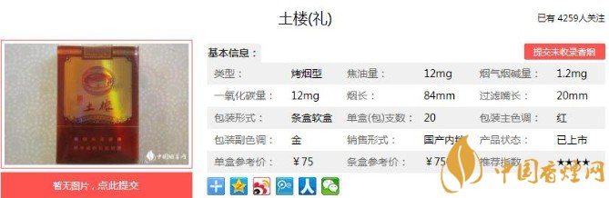 這款香煙的煙氣平衡是非常的不錯的,三個指標(biāo)達(dá)到了平衡的臨界點,這也難怪這款香煙可以作為土樓的高檔香煙了。濾嘴的設(shè)計,就顯得比較貴氣高檔,整體的煙支也好看。下面便是土樓(禮)的基本參數(shù):焦油量:12mg 煙堿量:1.2mg 一氧化碳量:12mg.