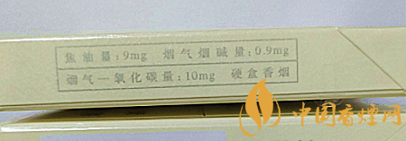 類型 :烤煙型 焦油量 :9mg 煙氣煙堿量 :0.9mg 一氧化碳量 :10mg