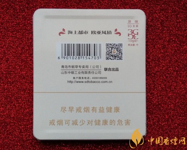 泰山(3G原味)采用3D鐵盒裝置,以青島五四廣場(chǎng)的建筑性標(biāo)志為主圖背景,突出青島這座海山都市獨(dú)有的文化底蘊(yùn)。它的焦含量中等,煙香馥郁芬芳中夾帶著些許的甜潤(rùn)感,吸味醇正細(xì)膩,簡(jiǎn)約而時(shí)尚個(gè)性的外觀,深受時(shí)尚界煙客的喜愛。為了對(duì)這款泰山雪茄型香煙價(jià)格有一個(gè)詳細(xì)的了解,先來(lái)看看這款泰山雪茄多少錢一盒?據(jù)小編調(diào)查得知市場(chǎng)售價(jià)為25元/包。
