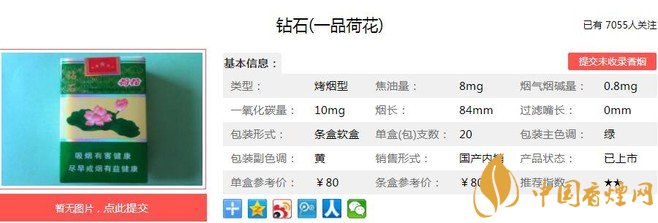 鉆石一品荷花于2014年上市,在高端卷煙市場占用很大的份額,濃淡適中的香氣,勁頭適中成為很多人的口糧。清雅脫俗的包裝設(shè)計(jì)更讓人愛不釋手,經(jīng)香煙網(wǎng)小編市場調(diào)查鉆石一品荷花售價為80元/包。