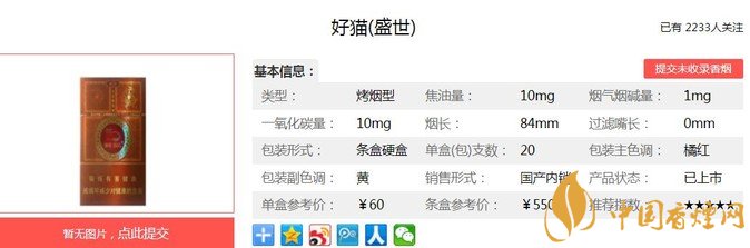 好貓盛世以高香低危害為主要設計方向,主要原料精心選用自然醇化兩年以上的云南、津巴布韋煙葉,突出產(chǎn)品優(yōu)雅的清香,煙香豐富諧調。在香料配方中首次采用具有生物減害技術的中草藥“豐和液”,使有害氣體得以轉移降解,達到了“生津不起痰,回甜不口干”的良好效果。經(jīng)香煙網(wǎng)小編市場調查好貓盛世售價為60元/包。