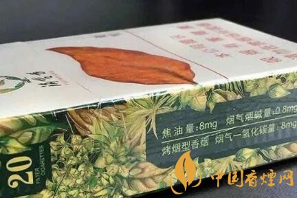 看名字,就能猜出個大概,這是重慶煙。只是煙盒正面圖案上一片大大的煙葉,卻令我不由得想到了“黃金葉”這個品牌。煙盒正面色調(diào)為乳白色又滲進了些淺綠色,整體為淺綠色,預示著這款香煙口味應該偏淡。側面的理化指標為8mg,也說明了這一問題。