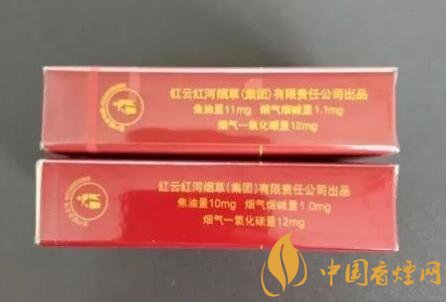 翻轉(zhuǎn)至煙盒的左側(cè),都是生產(chǎn)廠商的名稱和這款香煙的理化含量標(biāo)識。廠家同為“紅云紅河煙草(集團(tuán))有限責(zé)任公司”。