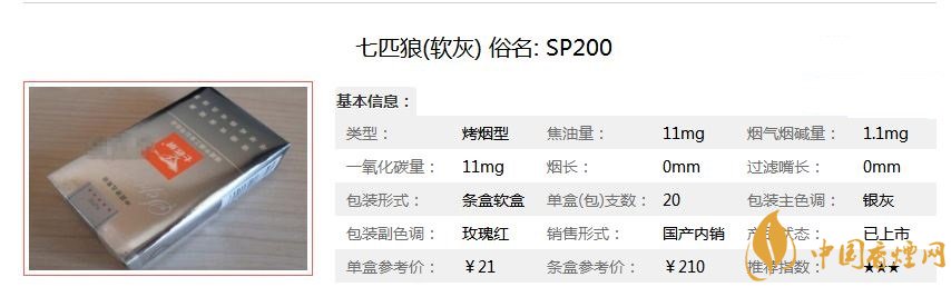七匹狼軟灰亦稱七匹狼(SP200),精選國內(nèi)外優(yōu)質(zhì)烤煙,人工片選精華,運用國際先進(jìn)的無氟及過濾技術(shù)、HXD烘絲工藝,由全新的國際一流廠房和設(shè)備精工制作,氣質(zhì)卓越優(yōu)雅,品味自然純正,煙草本香流露無遺,是比較經(jīng)典的具有較高性價比的狼煙。經(jīng)香煙網(wǎng)小編市場調(diào)查七匹狼軟灰售價為21元/包。