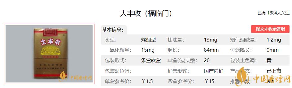 青“大豐收”為中國第一個卷煙共享品牌,是隸屬于中國煙草總公司的卷煙商標,制煙工藝經典純正,致力于找尋卷煙最原始自然的口感,化繁為簡,不加香精香料,品出煙草本真的味道。下面便是大豐收(福臨門)的基本參數:煙支長度:84mm 焦油量:13mg 煙氣煙堿量:1.2mg 煙氣一氧化碳量:15mg.