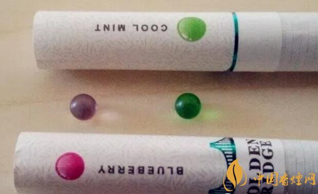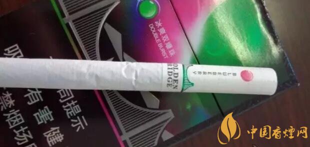 國(guó)產(chǎn)爆珠香煙金橋煙支上一道綠箍,一座綠色的金門(mén)大橋坐落其上,暗示了這包煙即使不爆珠也自帶的涼味。水松紙上有爆珠示意圖,靠唇端是紫紅色的藍(lán)莓,靠煙絲端是翠綠色的薄荷。又要用圓點(diǎn)顯示爆珠位置,又要用英文字母標(biāo)注爆珠口味,如果同處一側(cè)將顯得擁擠,因此二者分居濾嘴兩側(cè)錯(cuò)開(kāi)。煙支上沒(méi)有漢字,GOLDEN BRIDGE、BLUEBERRY和COOL MINT,營(yíng)造出了外煙的既視感。
