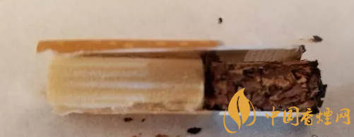 剖開(kāi)歐免The King濾嘴,是經(jīng)典的一段式醋酸纖維絲束濾嘴段。從絲束的顏色變化,很容易看到降焦孔開(kāi)在了絲束的前1/3位置,顏色變化均勻。降焦孔后,每個(gè)孔位置,有條帶狀的顏色加深,是空氣介入流動(dòng)所致。從煙絲外觀(guān)看,煙葉的品級(jí)非常好,用料實(shí)。攤開(kāi)煙絲,看到的是明黃、棕黃的烤煙煙絲比例較大,間雜有比例稍小的深棕色的晾煙煙絲,未見(jiàn)涂布制絲和膨脹制絲。里面混雜與切成薄片狀的煙梗。#p#副標(biāo)題#e#