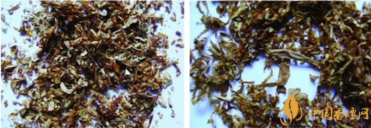 真品煙絲結(jié)構(gòu)為葉絲、膨脹葉絲,切絲寬度基本一致,色澤金黃油潤(rùn);假煙煙絲呈現(xiàn)黃褐色,切絲寬窄不一,假煙煙絲中常夾雜有膨脹梗絲,有異味,無(wú)膨脹葉絲的,切絲不均勻。