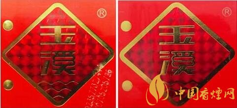 (2)真品卷煙玉溪商標燙金圖案,圖案燙金完整清晰,無漏燙現(xiàn)象,菱形圖案邊緣燙金線呈現(xiàn)凹槽。該款假冒卷煙商標燙金圖案燙金有漏燙或掉金,菱形圖案邊緣燙金線平整。(圖2左真右假)
