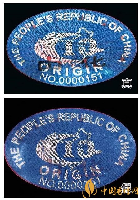 4、“中華”原產(chǎn)地標(biāo)志為藍(lán)色橢圓形,折光可見“中華”字樣、8顆“★”及天安門圖案。真煙色彩飽滿,圖案清晰;假煙色彩暗淡,圖案模糊。