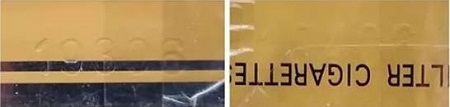 真品卷煙鋼印打印的數(shù)字感覺較為粗糙,有力度感且排列不整齊。該款假冒卷煙鋼印打印比較輕,無(wú)力度感且排列整齊。(左真右假)