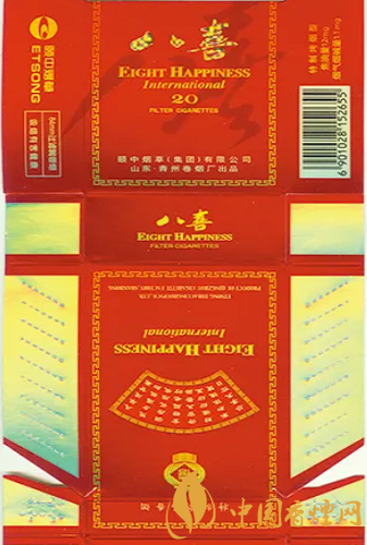 “八喜”香煙高貴典雅的煙標裝潢設(shè)計,曾獲得第八屆華東裝潢設(shè)計大獎?wù)棺罴褎?chuàng)意獎。“八喜”香煙問世后,青州卷煙廠得知人們很想知道“八喜”具體指哪“八喜”,于是該廠于1999年向社會廣泛征集吉祥語,從中精選出“久旱逢甘霖、他鄉(xiāng)遇故知、洞房花燭夜、金榜題名時、升官又晉爵、財源紛紛至、家和體魄健、盡享天倫日”等八句具有代表性的吉祥語,作為“八喜”的詮釋和具體所指。