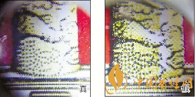 3.小盒背面華表底座微縮印刷工藝差異對比:真煙微縮防偽印刷圖案效果呈現(xiàn)主次分明、清晰度高、套印準確的特點;假煙采用照相或掃描的方法仿制,字體及圖案變形增大,無主次感,微縮字體及圖案比較粗糙,呈現(xiàn)出來的效果是模糊不清的。