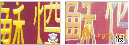 真煙燙金字體線(xiàn)條清晰、不漏金,金色部分成色純正;假煙燙金字體線(xiàn)條不清晰,有漏金現(xiàn)象,金色部分成色暗淡。