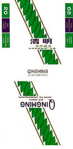 中國第一個(gè)以“清明”為牌名的煙標(biāo),是由山東益都(今青州)卷煙廠出品的“清明”煙標(biāo)。白底色的畫面上醒目的“清明”兩字,底下是拼音字母“QINGMING”。綠色的枝葉簡潔而素雅,賦予了“萬物生長此時(shí),皆清潔而明凈”的含義。