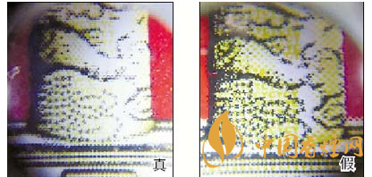 3.小盒背面華表底座微縮印刷工藝差異對比:真煙微縮防偽印刷圖案效果呈現(xiàn)主次分明、清晰度高、套印準(zhǔn)確的特點(diǎn);假煙采用照相或掃描的方法仿制,字體及圖案變形增大,無主次感,微縮字體及圖案比較粗糙,呈現(xiàn)出來的效果是模糊不清的。